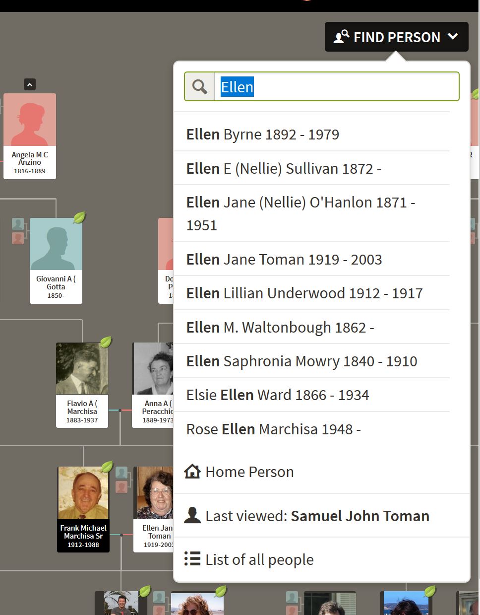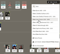 Because everyone accessing this tree shares the same read-only user account, the first screen you see will likely be the last screen that someone else viewed. To get to a starting point that makes sense to you, you need to enter the name of the person in the tree that you want to see first.
