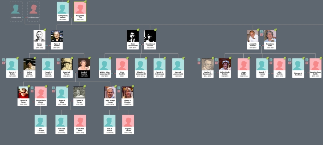 To view all of the detail in Jim’s family tree you must login into www.ancestry.com using the marchisatoman account. The username for the account is marchisatoman and the password is manchester47!!. When you login, Click the Trees button in the upper left and select Marchisa-Toman from the dropdown. If you need help navigating the ancestry.com site, email Tom and he’ll send you a user guide. The screenprint below is part of the Sasiela branch of the marchisa-toman tree.